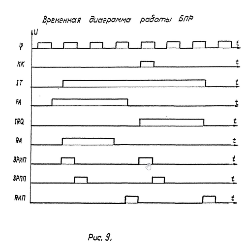 При поступлении в БПР сигналов прерываний - ловушек или сигналов нарушений-прекращений запускается БСБПР - по сигналу IT или PA соответственно. PA может возникать в любой момент выполнения команды, IT возникает лишь после окончания команды, перед выполнением следующей команды. БСБПР вырабатывает сигналы RA или IRQ , которые поступают на ПЛМ ДШК, ЗРИП, по которому производится запись в РИП всех имеющихся к этому времени запросов. В БРП, в соответствии с самым высокоприоритетным запросом, формируется код, который поступает на входы РПП (находящегося в блоке управления ПЗУ) и на входы ДШ КИП для последующего сброса источника запроса по сигналу РИП