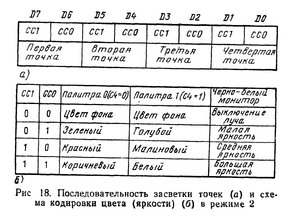 В режиме 2 каждая точка может быть окрашена одним из трёх цветов из выбранной палитры (доступно 2):