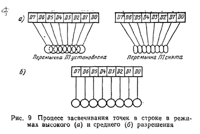 В режиме высокого разрешения, в зависимости от установки перемычки П1, контроллер может работать аналогично режиму среднего разрешения (П1 снята), тогда в строке выводится 640 независимых точек, либо, за счет снижения разрешения (П1 установлена), яркость соседних точек усредняется (используется для бытовых телевизоров с узкой полосой пропускания).
