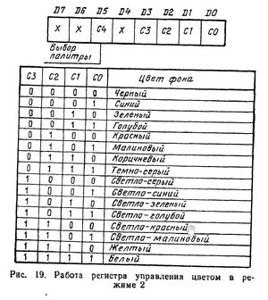 В режиме 2 каждая точка может быть окрашена одним из трёх цветов из выбранной палитры (доступно 2):