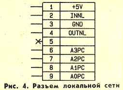 Этот интерфейс фактически не отличается от последовательного интерфейса. Он также реализован на микросхеме КР580ВВ51А. Адреса ее регистров соответственно 20Н и 21Н. Единственное отличие состоит в том, что к этому интерфейсу подводятся четыре сигнала А0РС, А1РС, А2РС, АЗРС, которые определяют номер устройства, подключенного к локальной сети. Для присваивания компьютеру определенного номера в разъем нужно вставить перемычку, соединяющую один из контактов с шиной +5 В.